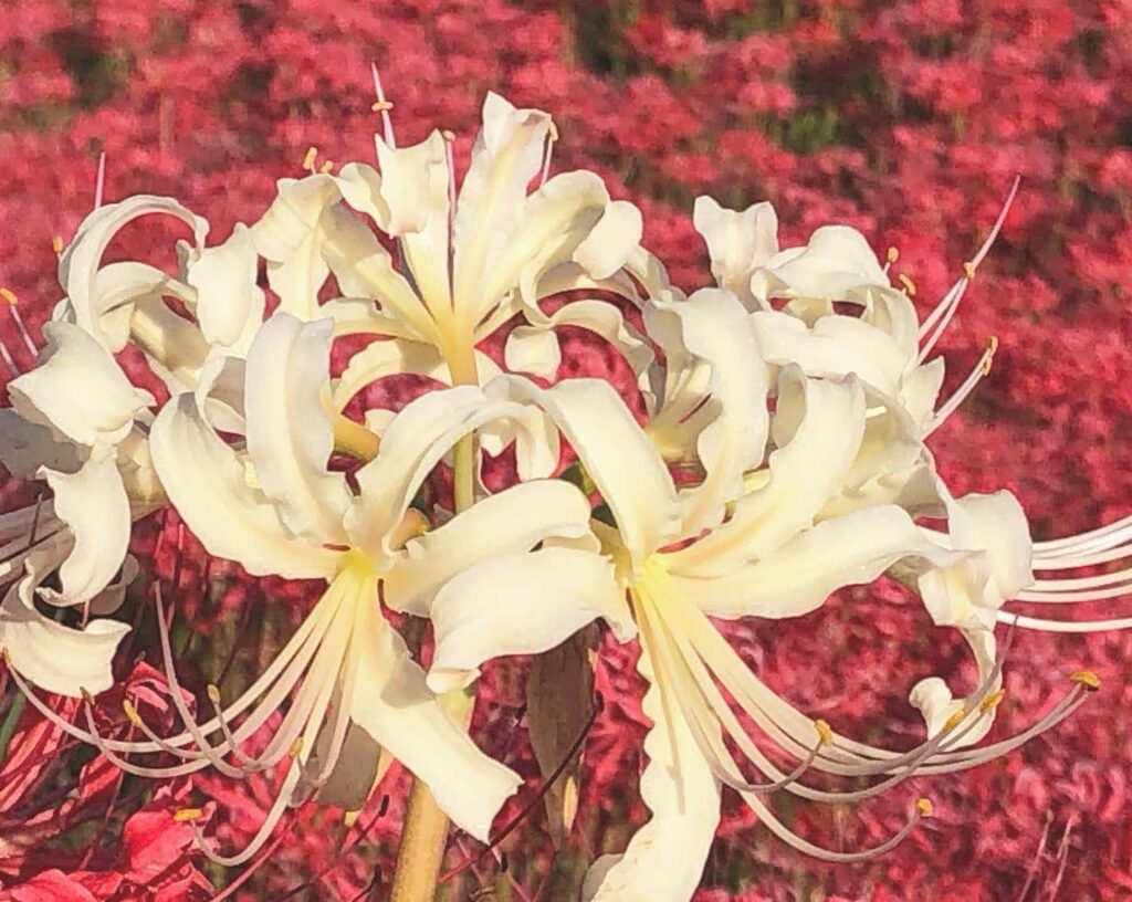 真っ赤な彼岸花と白い彼岸花のコントラストに感動して何枚も写真を撮ってしまいました。