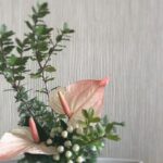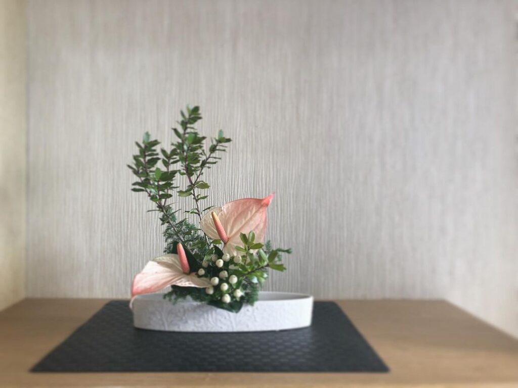 もちろん、クリスマスだとで定番の赤色のアンスリュームを使用してもいいのですが、クリスマスツリーやリースなど、飾りの色と被らない色合いで生けてみるのも良いかと思います。。