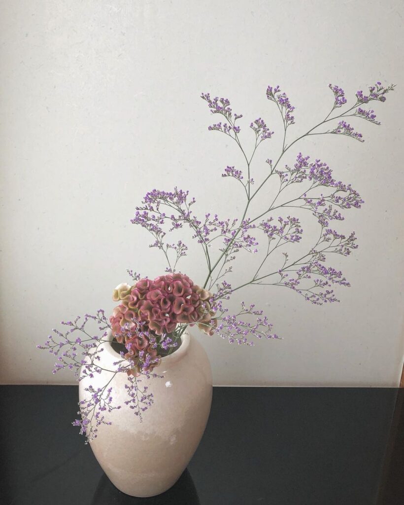 小さな花が点在するスターチスの場合は、一緒に生ける花(ここではケイトウ)にボリュームがある場合、長さがある方がバランスが取れる。