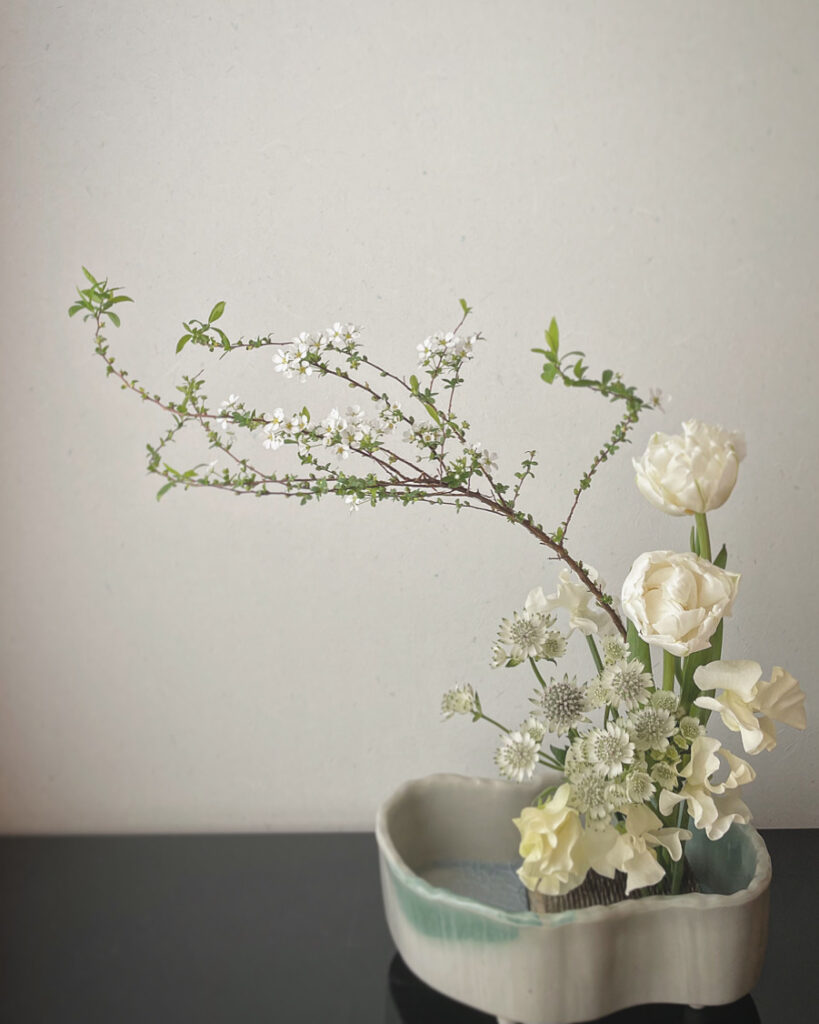 【春の花を飾ろう】白い花をメインに4種類の花材を使ったいけばな風アレンジ実例をご紹介