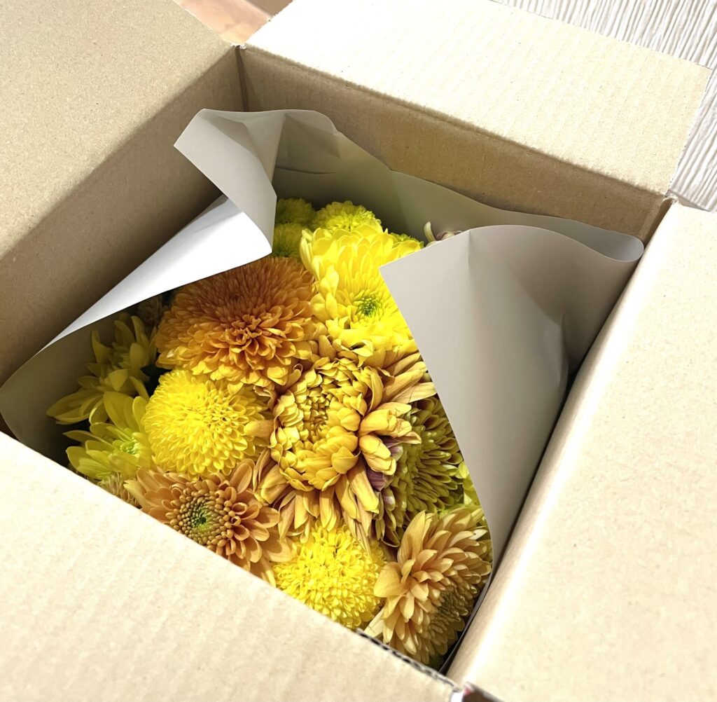 今回は『産地直送』の花束だったので梱包が事業者の方がされたものと思います。その為お花のことを考えた丁寧なものでしたが、色付きのラッピング用紙などではないベージュの用紙なのでギフトという点では少しシンプルさも感じました。