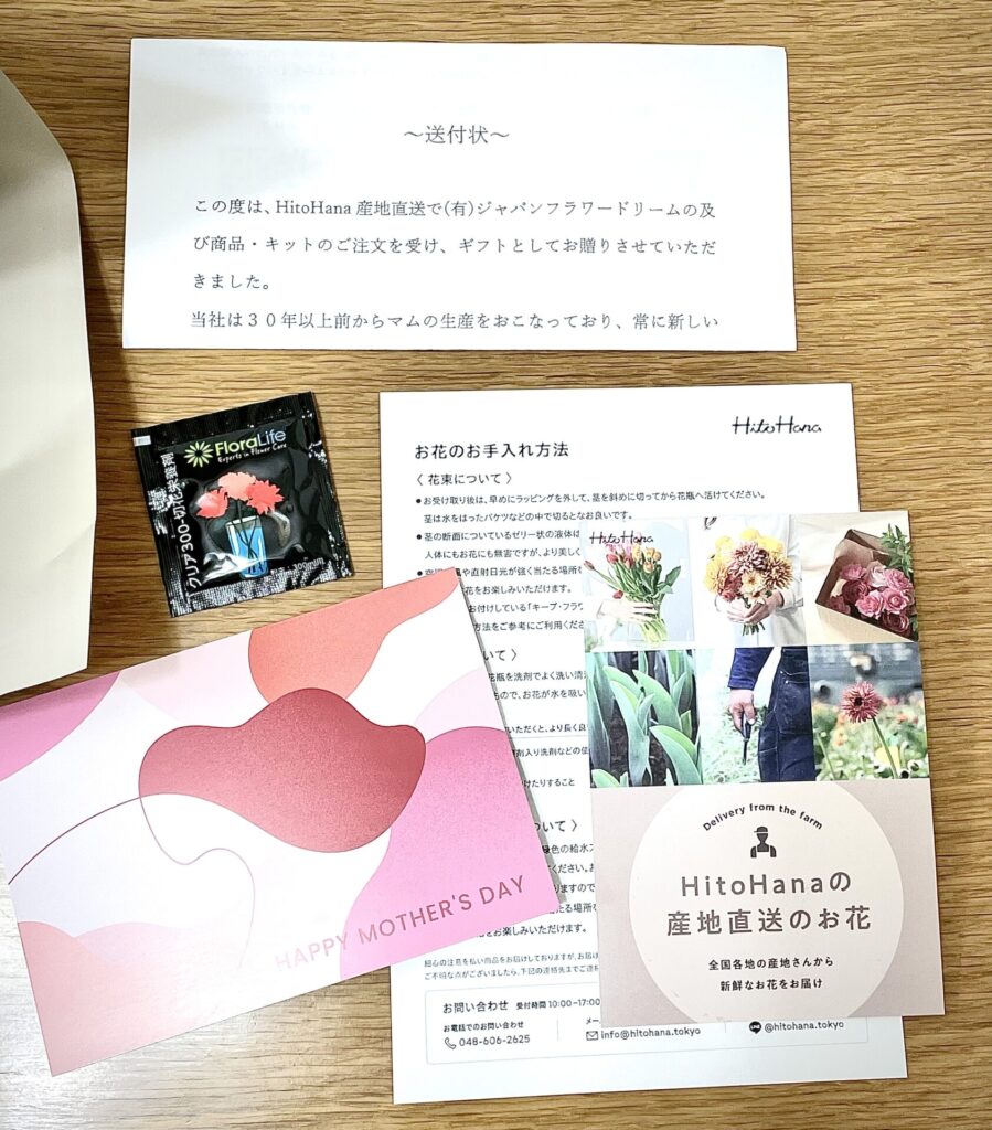 先日の『母の日』にHitoHanaさんを使ってお花が届きました。