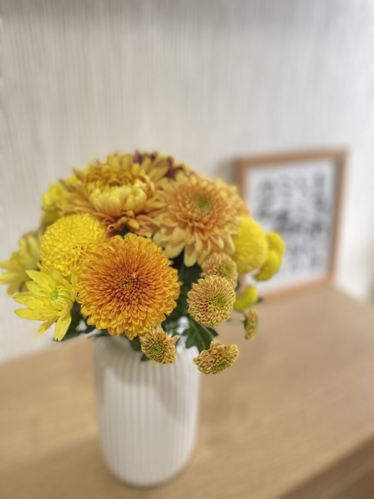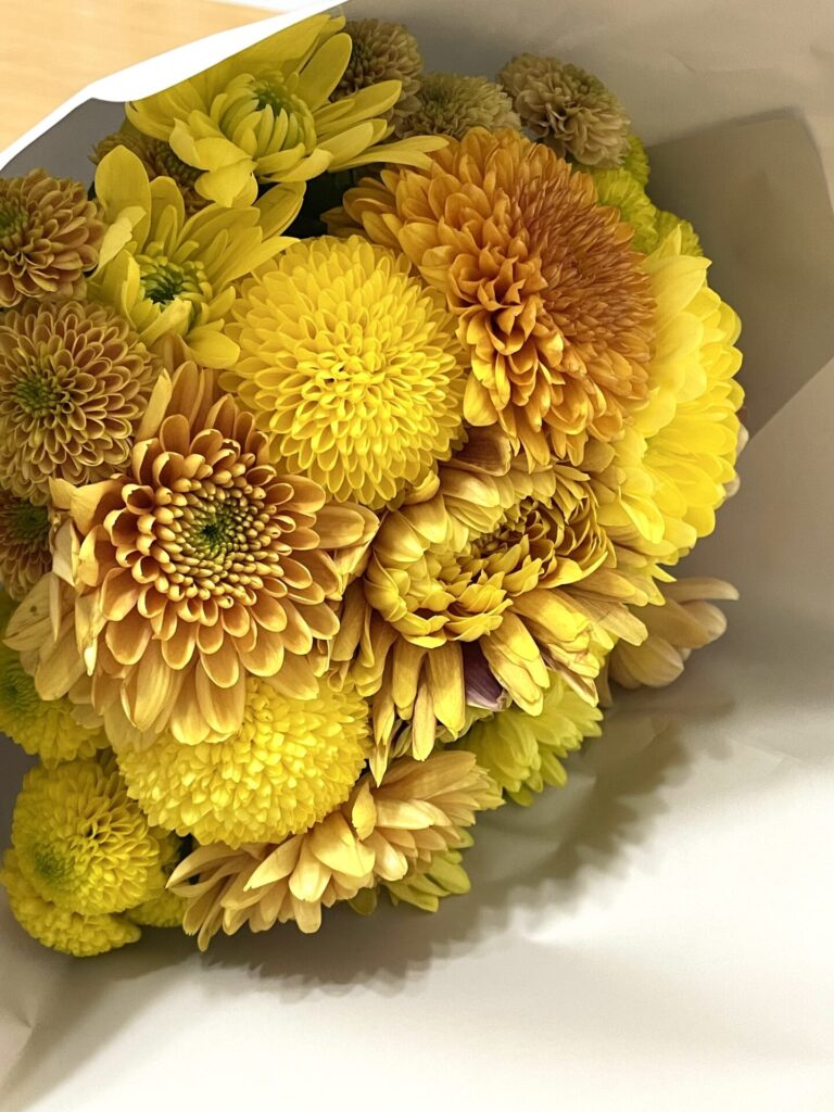 昔ながらの『菊』という和風のイメージでけだなくピンポン玉のようなピンポンマムやマーガレットのように花の中心がグリーンのもの、花びらの裏がオレンジ色のものなどたくさんの種類のマム(菊)が15本束ねられていて元気なる花束でした。