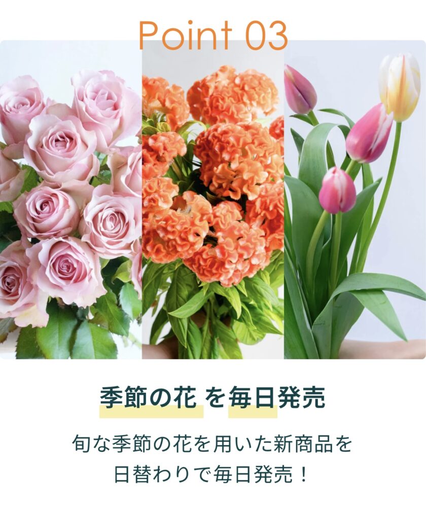 - 日替わりで販売するお花が変わっていくから季節の花を購入することができます。