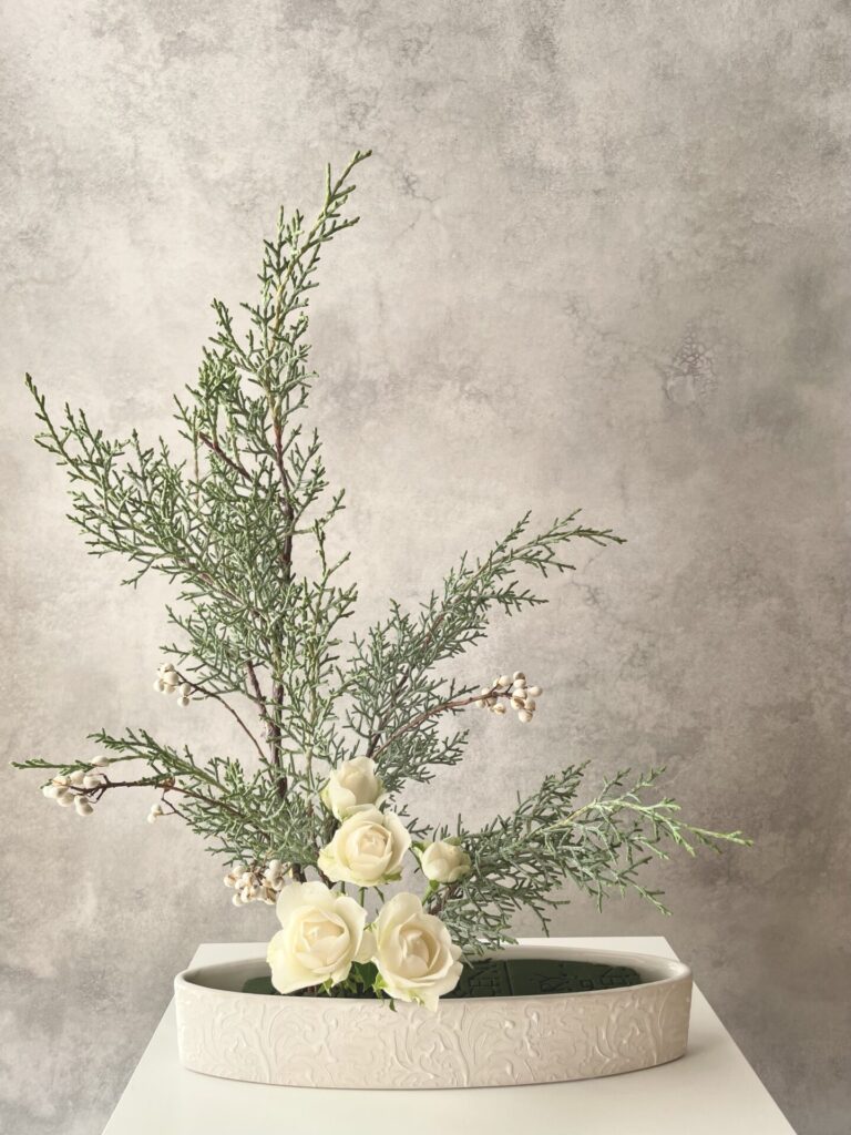 ハッキリとした彩りにな理がちなクリスマスカラーをあえて避け、ピンク色との取り合わせで柔らかく飾る、いけばな風アレンジです。
