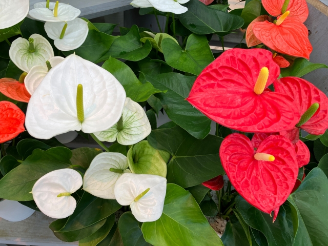 アンスリウムの仏炎苞は切り花としても多く使われています。育てる際には楽しみの一つになりますね。
