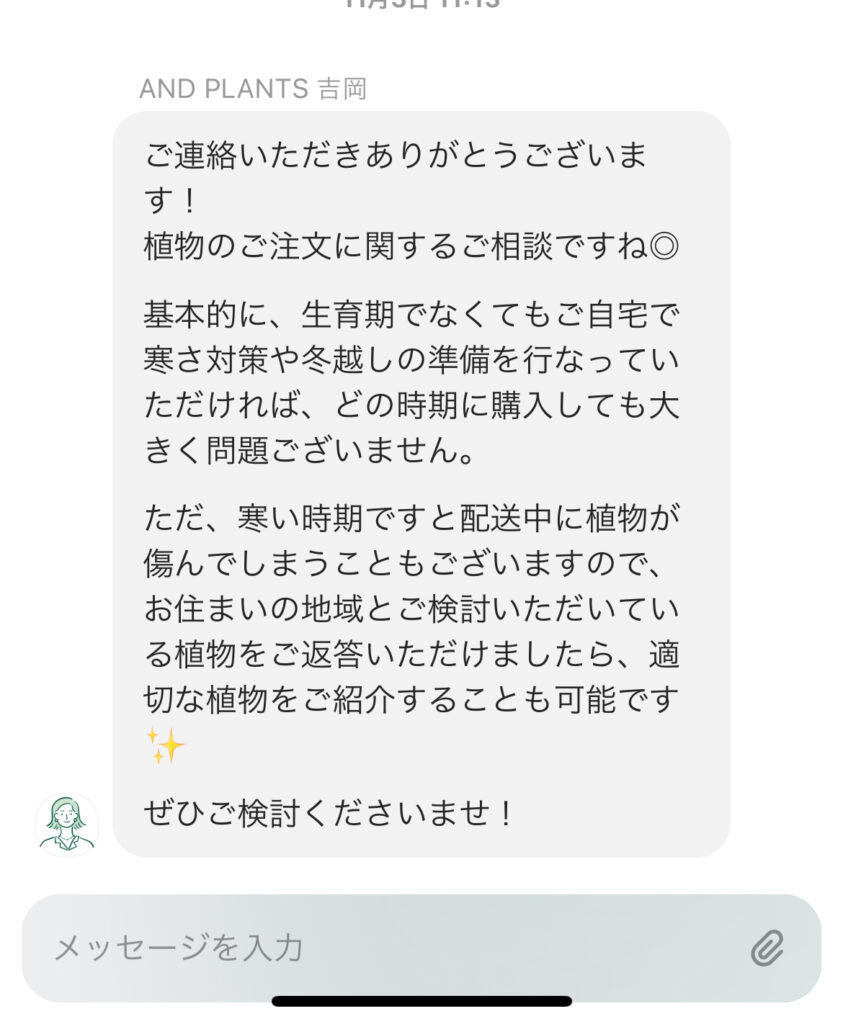 届いた植物は元気な状態で、これから育てていくのがとても楽しみにです。困った時にいつでも相談できる環境になっているも重要でとても安心ですね。