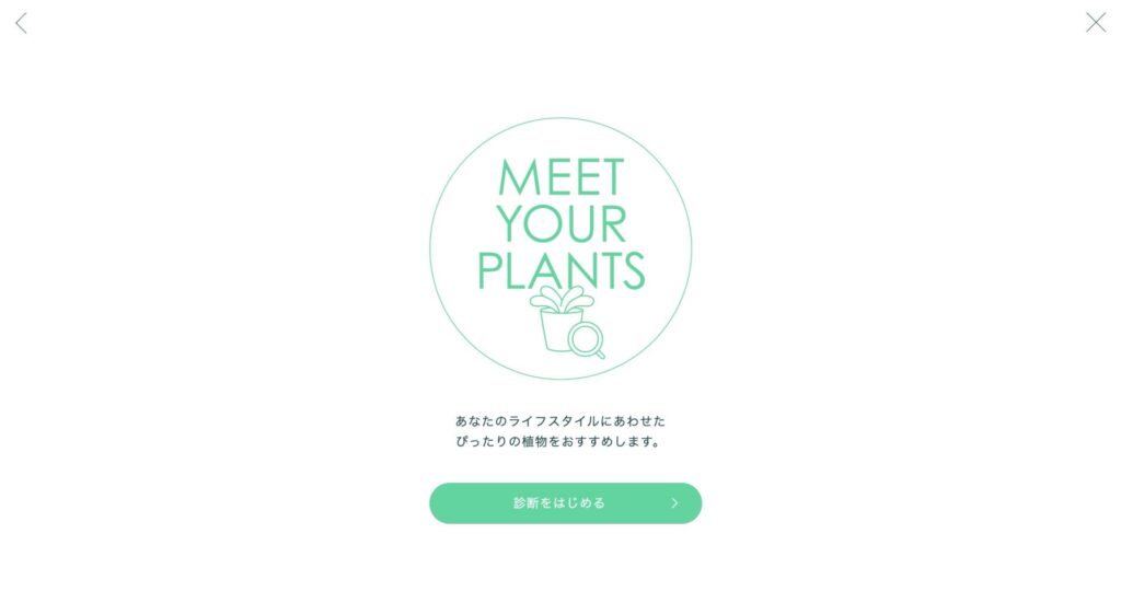 - 植物を置く予定の場所、育てた経験、好みの形などの10項目の質問に答えていくと140種類、640パターン以上の中から選んでくれます。
