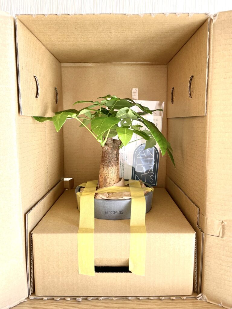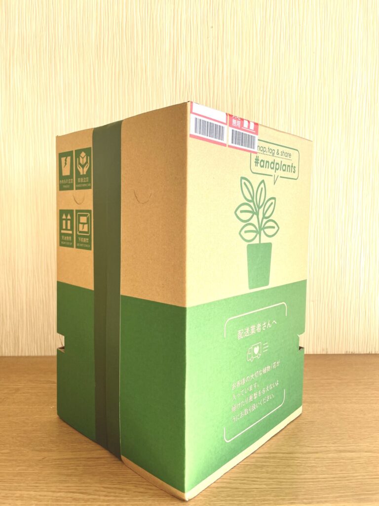パキラと同じように立てて開けられる段ボールです。段ボールには配送時の注意がしっかり印刷されていますし配達業者さんへのメッセージもあり、大切に運ばれてきたことがわかります。植物の固定もしっかりされています。