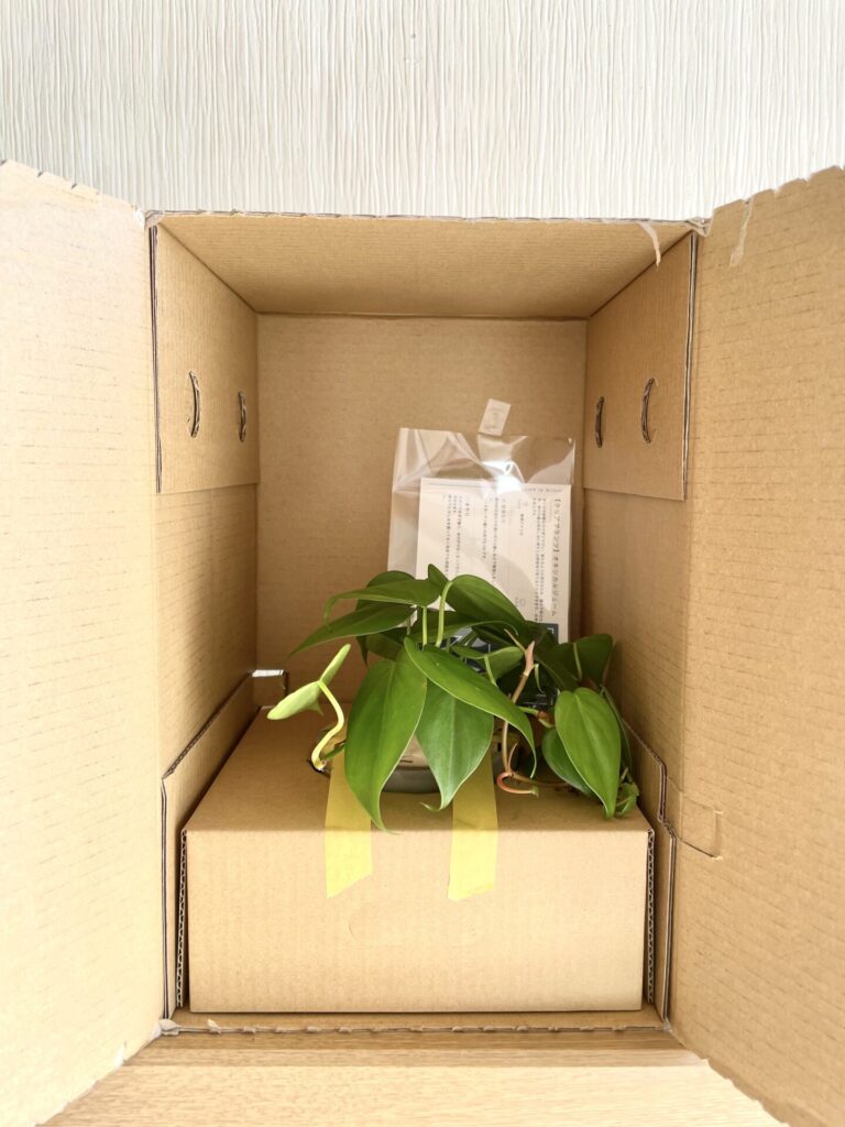 - 植物の配送によるダメージが最小限になるよう独自開発のダンボールを使った梱包で届く。