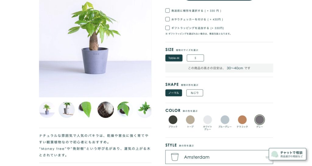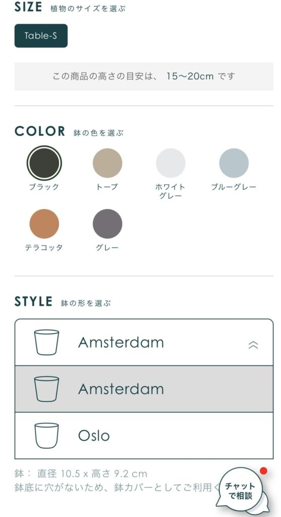 ネットで洋服を選ぶ時の様に、鉢の色をクリックすると植物を植えた姿が見られるので部屋に置いた時のイメージがしやすいです。ネット通販にありがちな『色の表示と自分の感覚が違う』ということは起こりづらくなるのではと思います。