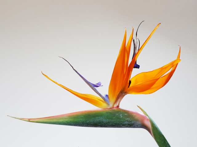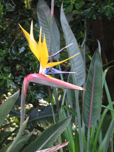 オーガスタに比べて、葉が硬く幅は細く中央の葉脈がピンク色です。鳥が羽ばたいたようなオレンジ色の花を咲かせるので『極楽鳥花』と呼ばれて、切花でも使用されます。